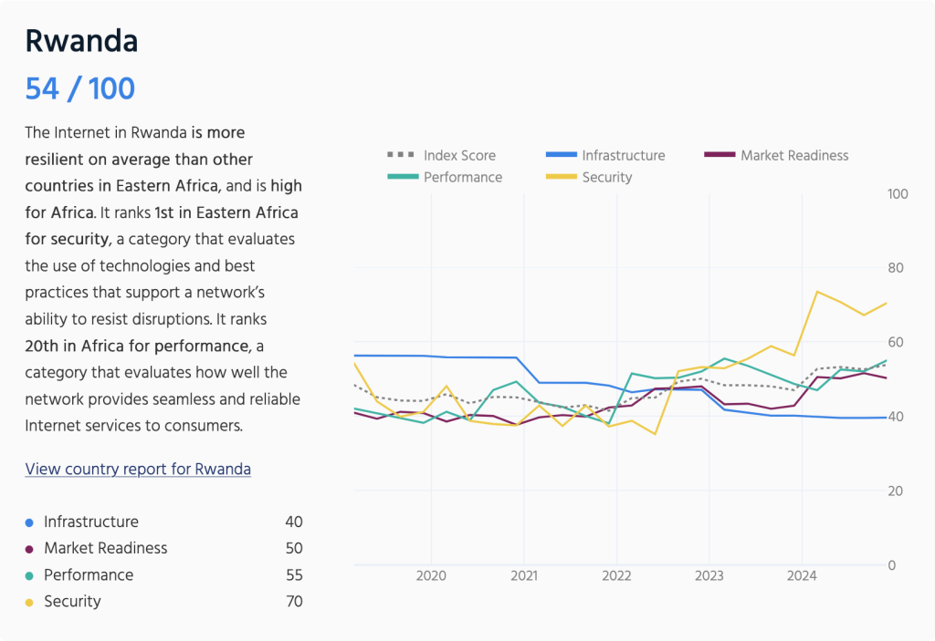 Rwanda experienced the greatest increase (7 points) among all countries, largely due to its DNSSEC validation rate increasing from 23% to 80% as well as significant improvements in its fixed and mobile performance, affordability and market diversity.