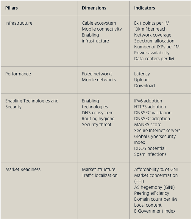 This is not an easy task. There are several building blocks that underpin this complex ecosystem. Additionally, the Internet landscape differs from country to country. To be able to objectively compare countries to one another, we need an objective set of metrics that we can use as a common ground.