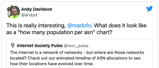 This is certainly a much more dynamic picture. The relative chaos of the 1990s and early 2000s is clear to see, and it's also interesting that viewed through this lens, the set of countries with the most network number allocations per capita has become more stable since around 2005. The British Virgin Islands has been the front-runner by this metric since around 2014.