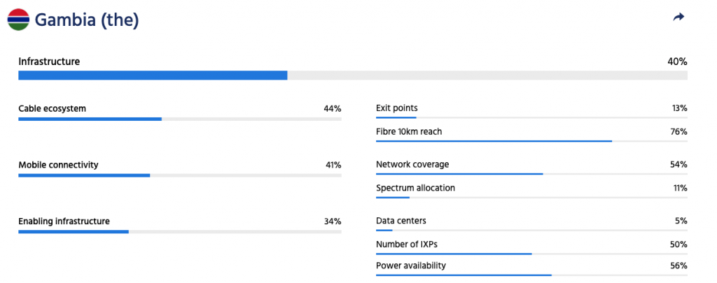 According to the Internet Society’s Internet Resilience Index, The Gambia has an overall resilience index of 43%, and is ranked 29th in Africa. With regards to infrastructure, the country has an index of 40% and is ranked 19th in Africa. The country has four exit points (international gateways), decent coverage of terrestrial fiber (75% of the population is within a 10-km reach of a fiber line), and a quite robust mobile connectivity score with 88% of the population covered by 3G.