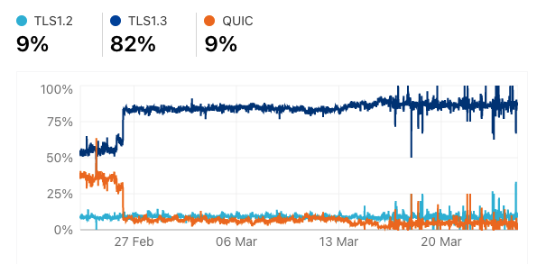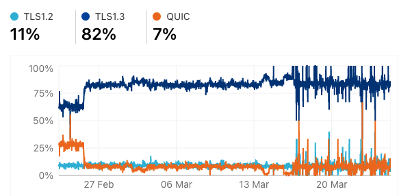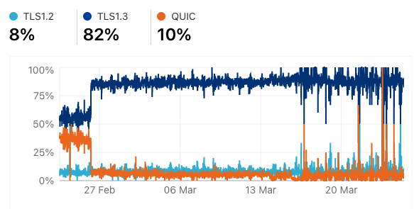 On the Pulse Enabling Technologies page, you can see that the average usage of TLS 1.3 and QUIC in the world matches the levels seen from the networks we are analyzing until the sudden change around the end of February - that is, around 64% for TLS 1.3 and 18% for HTTP/3-QUIC.