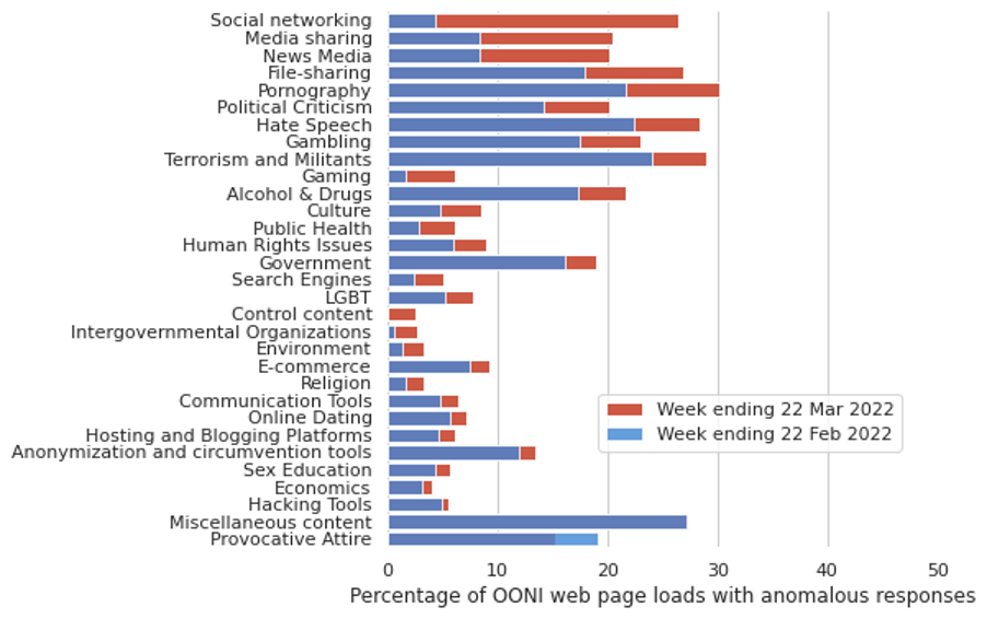 Nearly all categories of web content saw at least some increase in failures to load, including the category of “Control content” (websites unlikely to attract the attention of any censor), suggesting an increase in the background of network congestion.