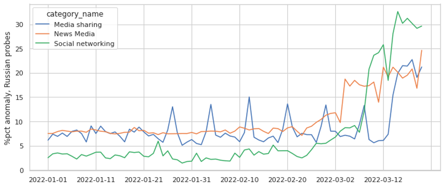 However, some categories were impaired much more significantly than the average, including social networking (increase in anomalous tests from 4% to 26%), media sharing (from 8% to 20%), and foreign news media overall (from 8% to 20%). These measurements are consistent with Russia’s imposition of Internet content blocks to restrict the domestic availability of information about the Ukrainian war.