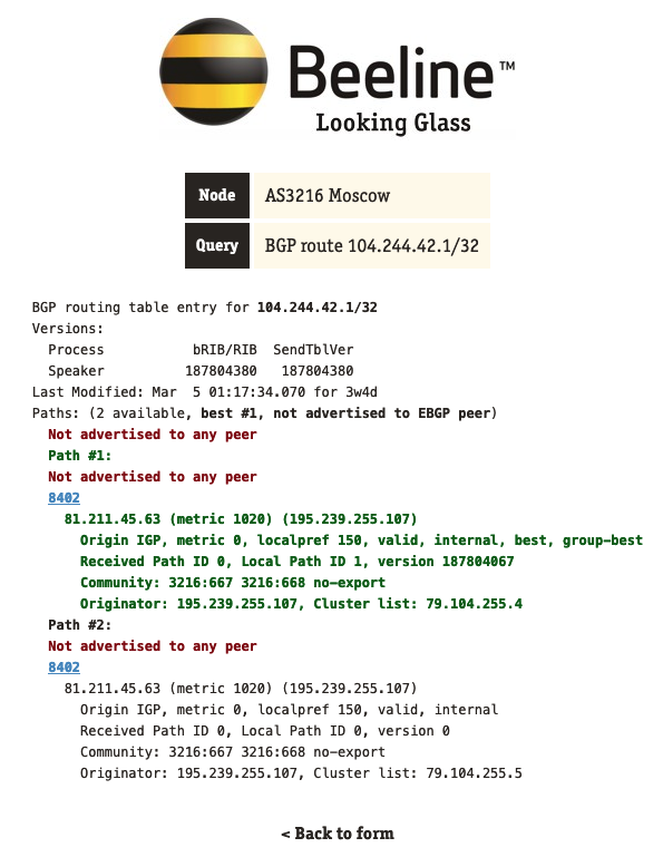 This particular incident involves an autonomous system, AS8342 - JSC RTComm.RU, which appears to have started announcing a network from Twitter’s.