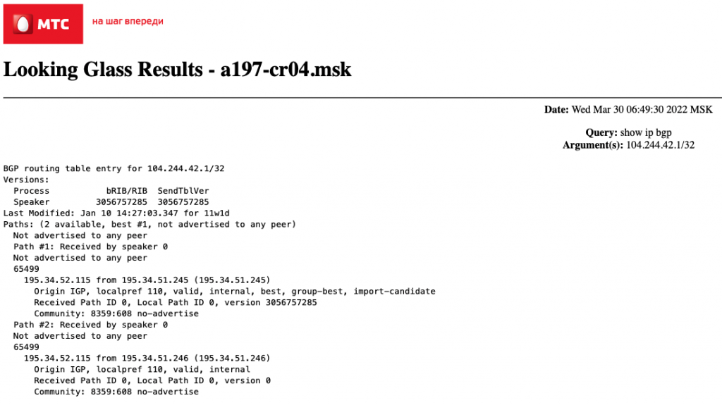 There is more that could be said about how Twitter is being blocked by network operators in Russia. One example is MTS (Mobile Telesystems PJSC, AS8359), which seems to also have internal BGP announcements redirecting its users who attempt to reach Twitter.