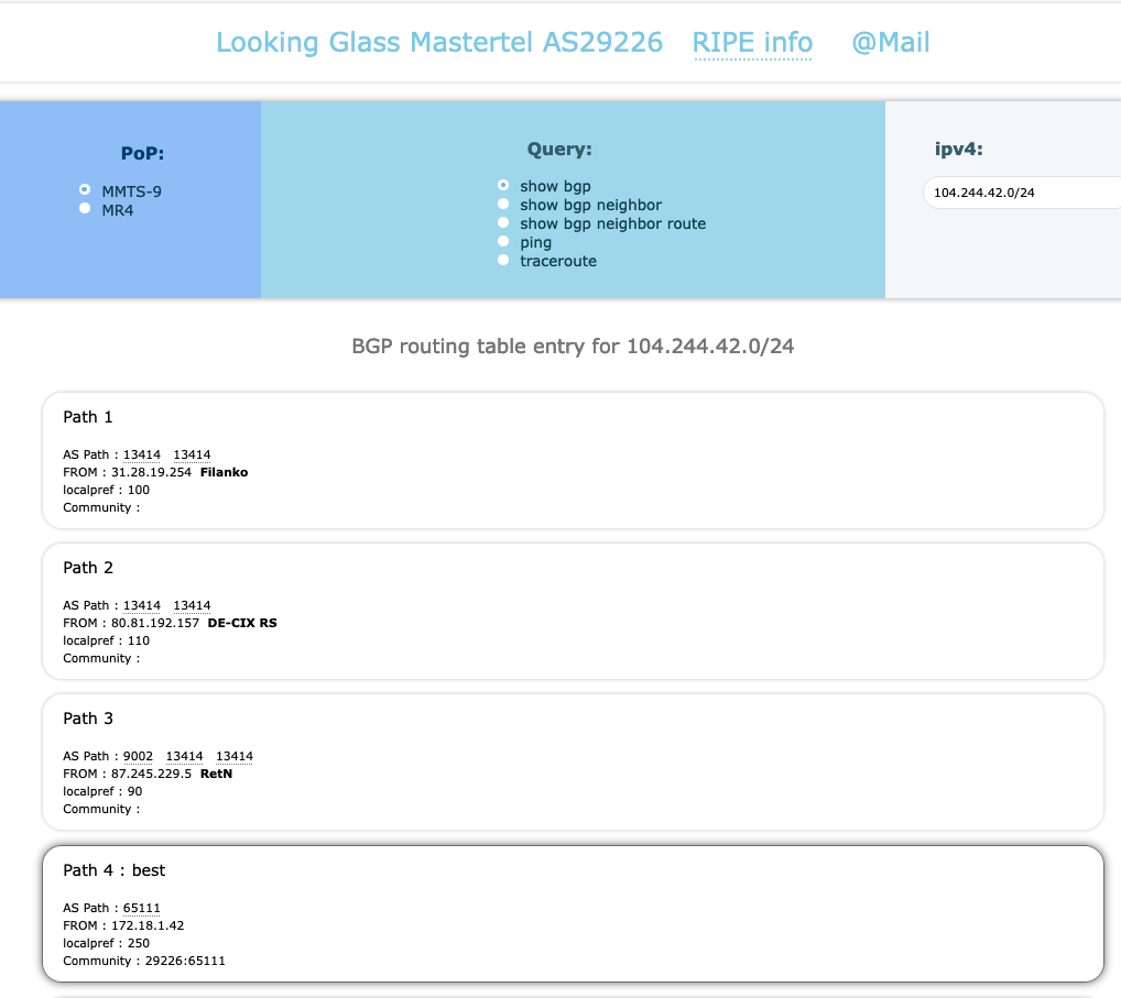 With these small notions in mind, let’s get back to what we have noticed. By means of tools called a “looking glass”, network engineers debug issues related to BGP Network announcements. Network operators voluntarily set up looking glasses so that engineers from other nework operators are able to see what is happening inside their network. This helps in terms of understanding the effects of certain BGP configurations and how counterparts receive and eventually install announcements.