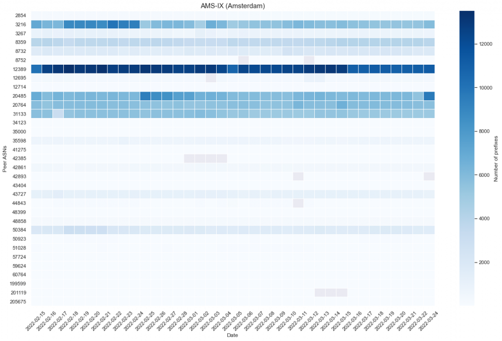 For the Amsterdam Internet Exchange (AMS-IX), the number of prefixes seen by Russian ASNs seems to have remained stable except for AS3216 (Vimpelcom) where we saw a sharp decrease - 40% - in the number of prefixes.