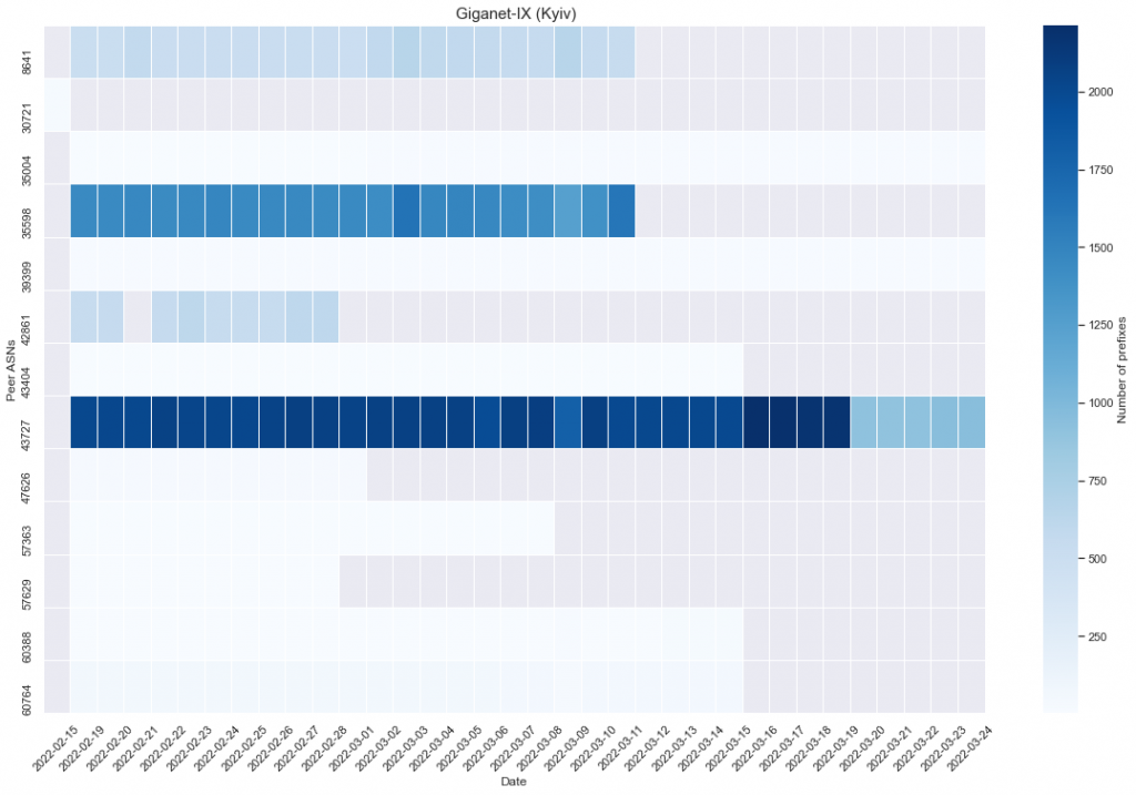 As we can see, many Russian networks stopped propagating their routes through the Giganet Exchange in Kiev, therefore breaking the direct connections between Ukrainian networks. It might be that these networks deliberately decided to shut down their BGP peering sessions based on instructions from the Russian authorities.