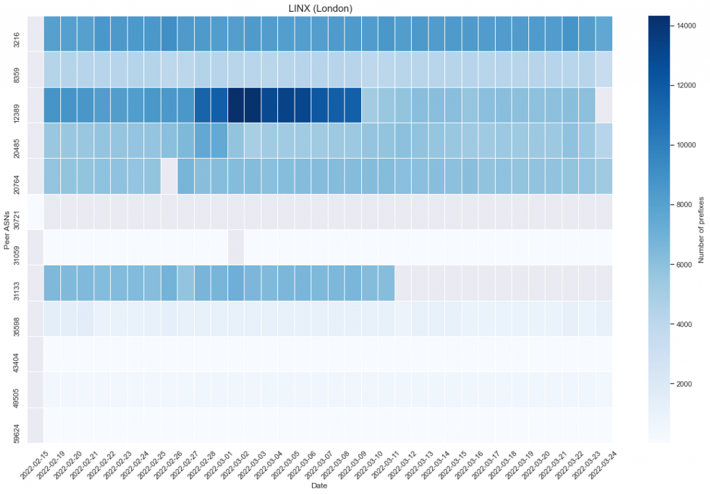 The most noticeable decrease was seen at LINX and the immediate effect of the sanctions were observed on AS12389 (Rostelecom) and AS31133 (Megafon). At least 50% of the routes by Rostelecom were withdrawn on 10 March and Megafon was simply de-peered (no prefixes found) as from 11 March. This means other networks peering on LINX now have less routes to send traffic to Rostelecom networks. They will still be able to send traffic to Rostelecom but will probably need to do so through longer paths, using common paid transit providers such as Lumen or Teliasonera rather than directly through the IXP. Similarly, Megafon will not be reachable through the LINX peering LAN and traffic to Megafon will be sent through alternative routes, through transit providers. These actions may have an increase on latency between LINX members’ networks and Rostelecom/Megafon networks.