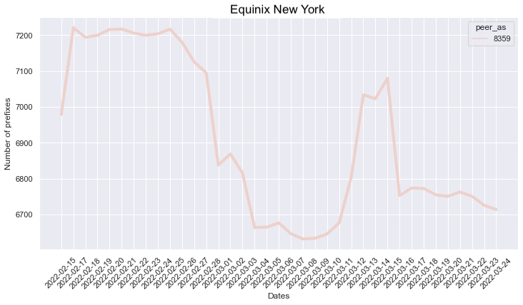 While most of the sanctions were EU-based, we observed some movements at Equinix-NY, where AS8359 (MTS PJSC) one of the main Russian ISPs, removed some 350 prefixes between 25 February and 8 March, which shows some instability in the number of routes served by MTS.