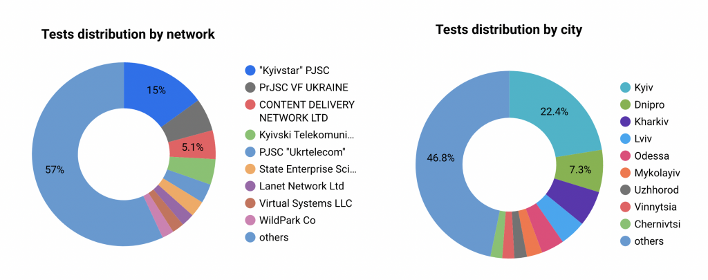 Most of the tests recorded so far are from the cities of Kyiv (22.4%) and Dnipro (7.3%) and the networks recording the most number of tests are Kyivstar (15%) and Vodafone (5.8%), which are both mobile network operators. Mobile Internet remains an essential tool for millions of displaced Ukrainians to stay in touch with friends and families and to get crucial news and information.