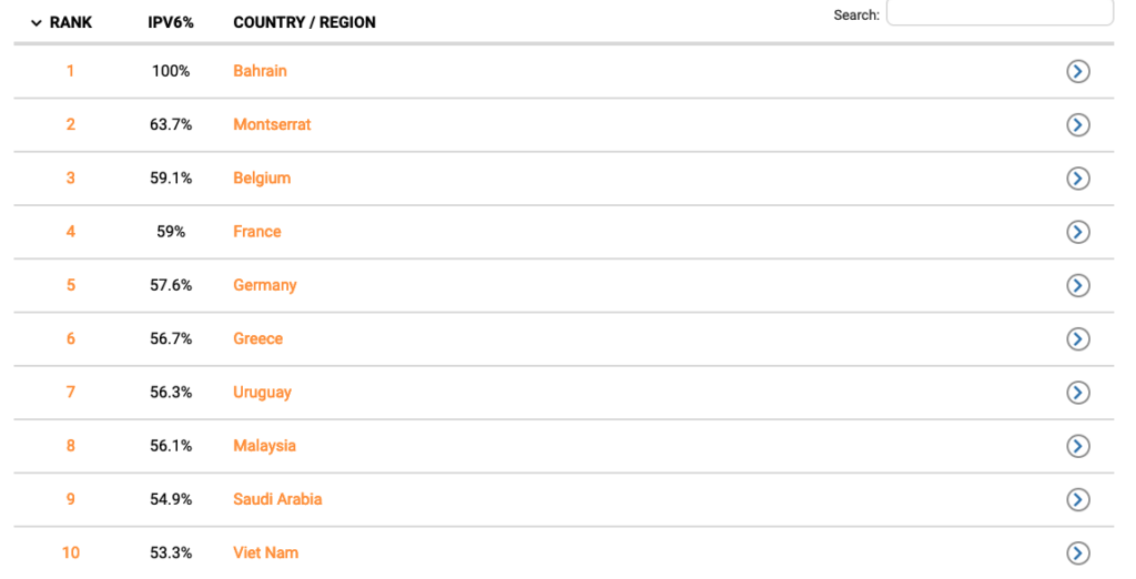 Table showing top 10 countries in the ranked by IPv6 adoption rate.