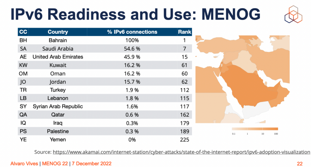 During the presentation, IPv6 in the MENOG Region, Alvaro Vives (RIPE NCC) shared the following slide (Figure 1) which stood out for me — it shows the readiness and use of IPv6 in the region.