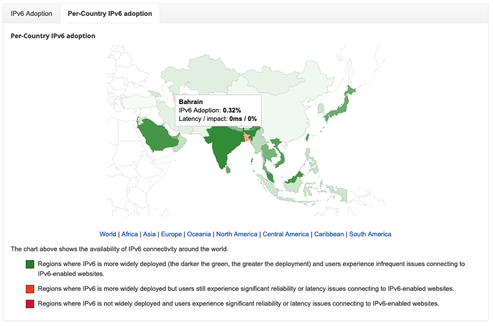 According to this data, 100% of requests to Akamai services coming from Bahrain come over IPv6. This was amazing news for those, like me, who have been trying to promote IPv6 for more than a decade now.