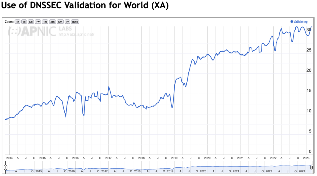 Looking at their chart for global DNSSEC validation (Figure 2), we can see current validation levels are around 30%.