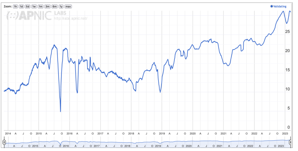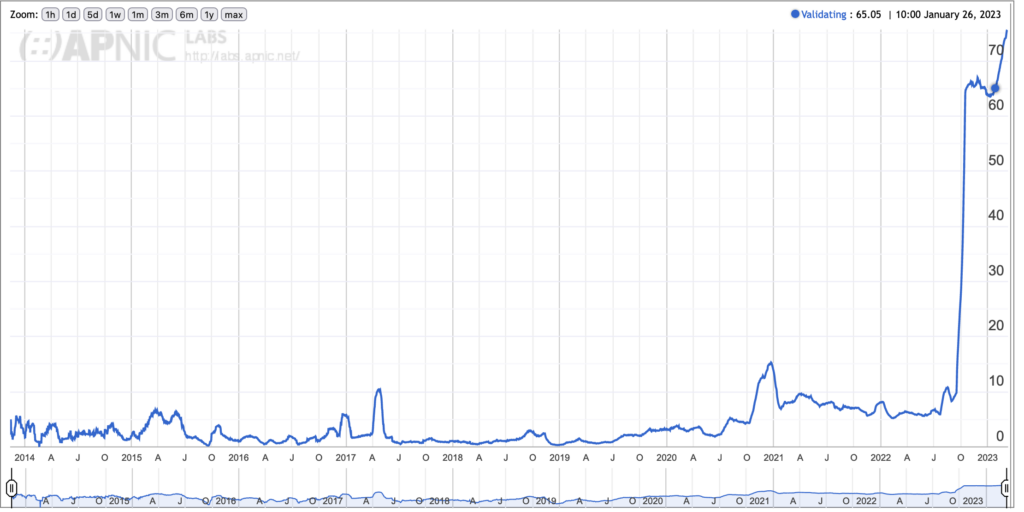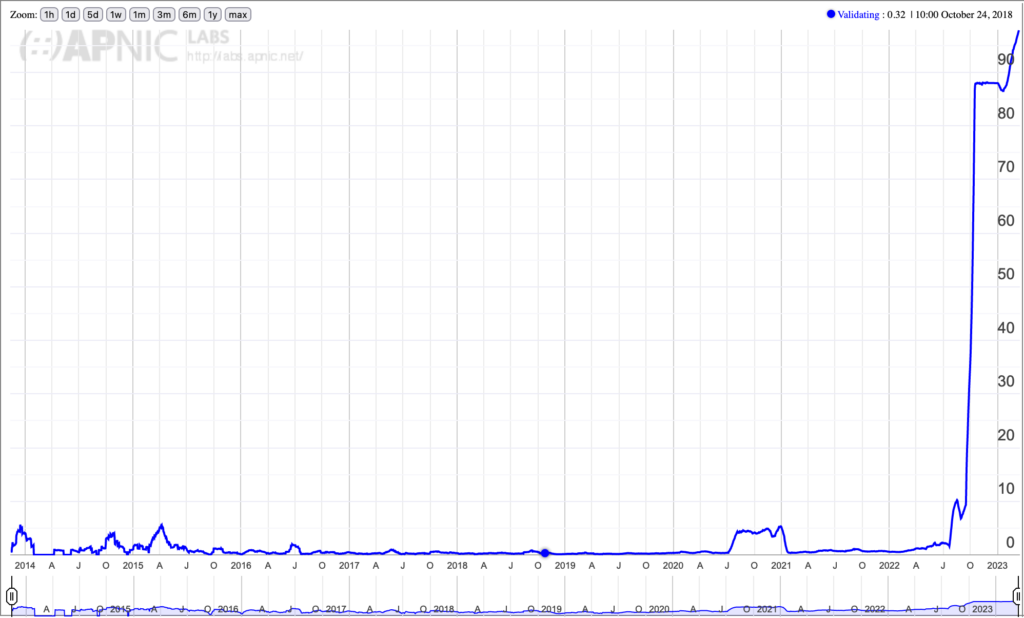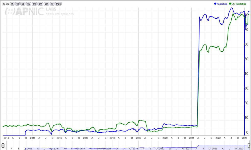 Note the interesting aspect APNIC Labs’ data shows that ASMedi had previously been validating DNSSEC back in 2014-2016, and then for whatever reason stopped validating for six years until they turned it back on in 2022!