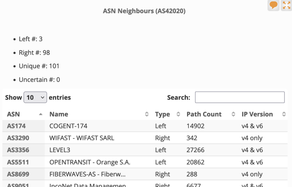 If we look at Lebanon’s configuration using RIPEstat (Figure 1), the Lebanese government’s network operator Ogero (AS42020), has 101 unique neighbors, or relationships with other Autonomous Systems (ASes). Of these,