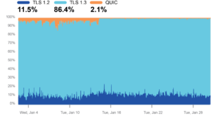 In both examples, we can see that the use of QUIC dropped drastically at one point in time. We believe this is due to the introduction of ‘middle boxes’ that inspect traffic but can't handle QUIC. This could be considered preparation to perform more in-depth inspection and user blocking.