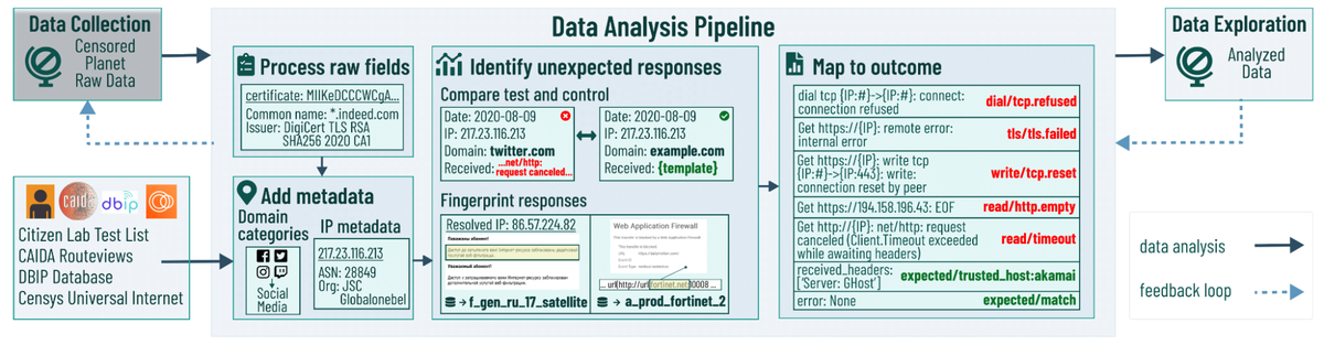 Collaborating with Google Jigsawwe built an open-source censorship data analysis pipeline tailored for Censored Planet that resolves many of the challenges we identify systematically. The pipeline parses measurement data and adds metadata from a variety of sources. Then it compares measurement responses to known fingerprints that act as censorship signals. Finally, errors during network measurements are mapped to a human-readable outcome to allow the data to be easily explored, which we make public via the Censored Planet Dashboard.