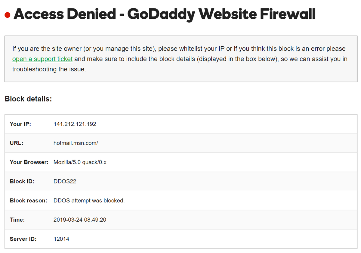 Figure 2 — GoDaddy server blocking Internet measurements by Censored Planet.