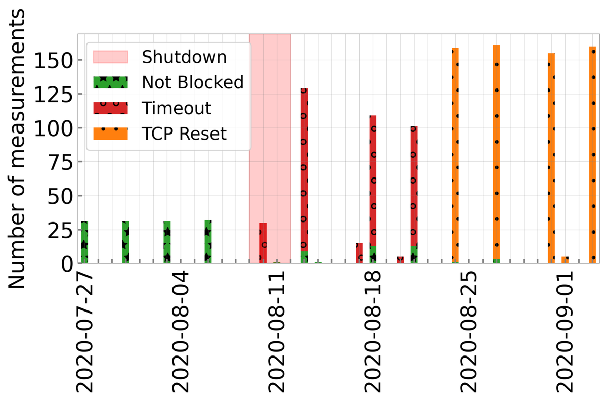 Figure 4 — SNI blocking of https://psiphon.ca around August 2020 in Belarus.