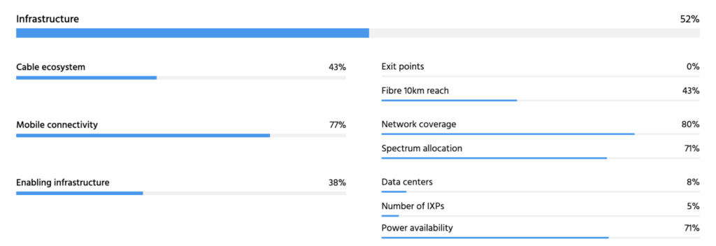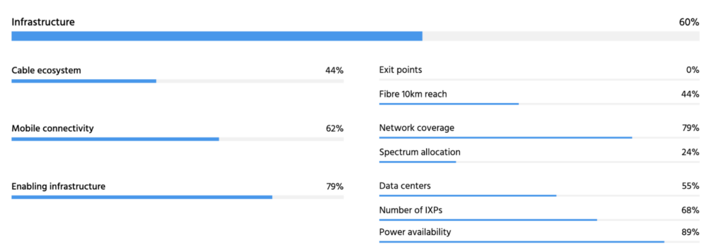 If we zoom into the data points that contribute to Costa Rica’s exceptional infrastructure score (60%), we can see that this higher-than-average score is due to several factors, including its: