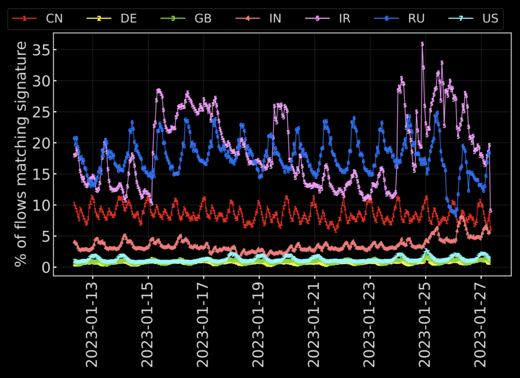 We applied our signatures to 0.01% of all incoming connections at Cloudflare, a large CDN provider with more than 275 points of presence and global connectivity. The results shown in Figure 4 are from two weeks of passive data in January 2023.