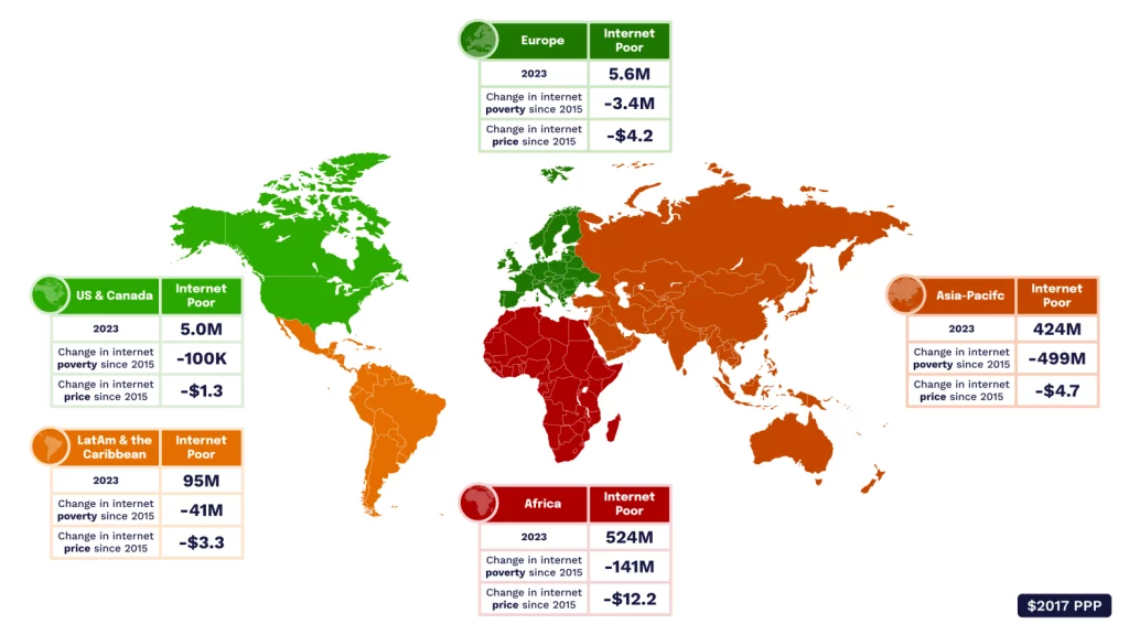 Over the last few years, the world has significantly reduced Internet poverty. While income poverty has stagnated since COVID-19, Internet poverty has declined due to a near-universal decrease in Internet prices. Additional price reductions will be crucial to progress further, as low prices allow poor people to connect and proactively use the Internet.