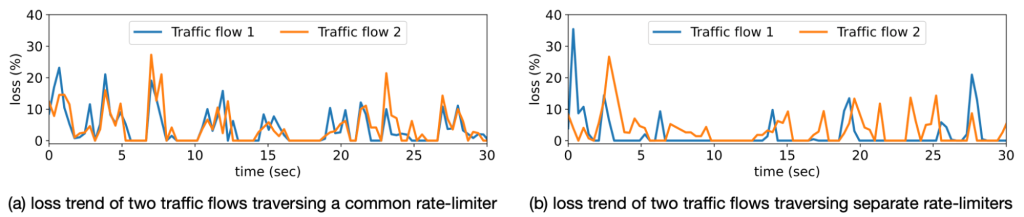 WeHe𝕐 detects general rate-limiters by statistically testing if the loss trends of traffic sent along the two paths are correlated. The rationale is that packets traversing the same queue should see similar packet drops (if any), so their loss trend is correlated (Figure 4. a). Otherwise, they will not observe the same loss events, and their loss trend will not be correlated (Figure 4. b).