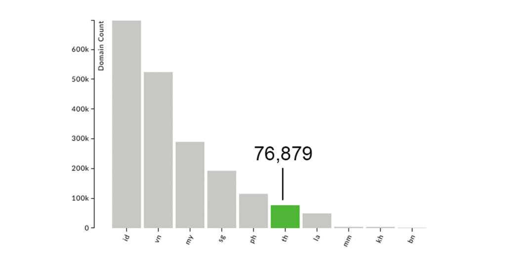 Of all Thailand’s resilience metrics, Domain count is the lowest (2%). According to Domain Tools (Figure 5), there are 76,879 .th domains registered, the fifth fewest of all ASEAN country code Top Level Domains (ccTLDs) and the third-fewest per population ahead of Brunei and Myanmar.