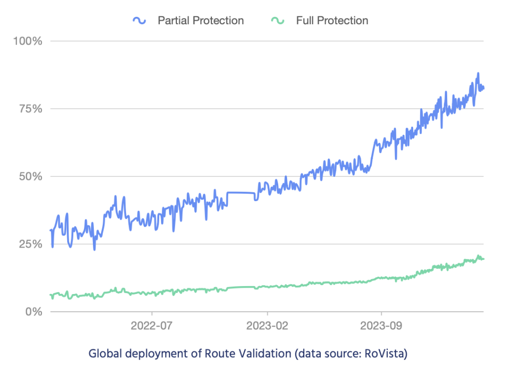 According to RoVista's metric, in 2023, partially protected networks nearly doubled from 44% to 81%, while fully protected networks saw a similar level of growth, going from 9% to 18%. This remarkable growth shows that the deployment of RPKI verification by larger transit networks is disproportionately impacting protection for their downstream customers. It would be nice if every network operator validated routes using RPKI. Still, we don't need that to be the case for widespread benefits to accrue from RPKI adoption by major transit network operators.