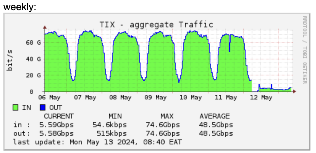 Tanzania has been most affected by the outage, with Internet connectivity falling by nearly 50% nationally, per IODA (Figure 9), and Internet traffic at the local Internet Exchange, TIX, dropping by almost 90% (Figure 10).