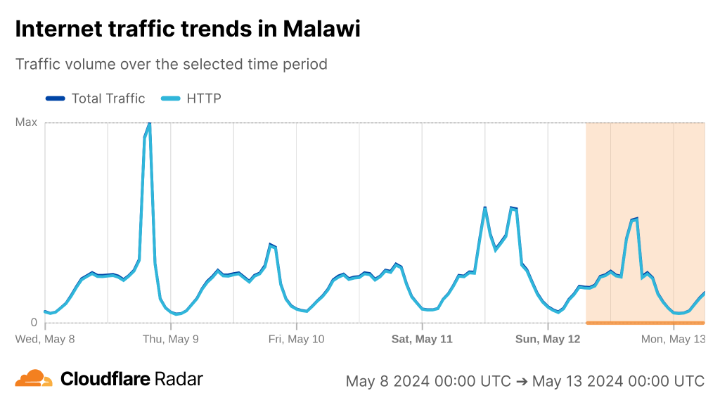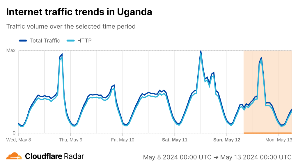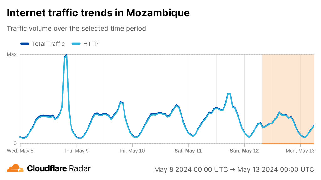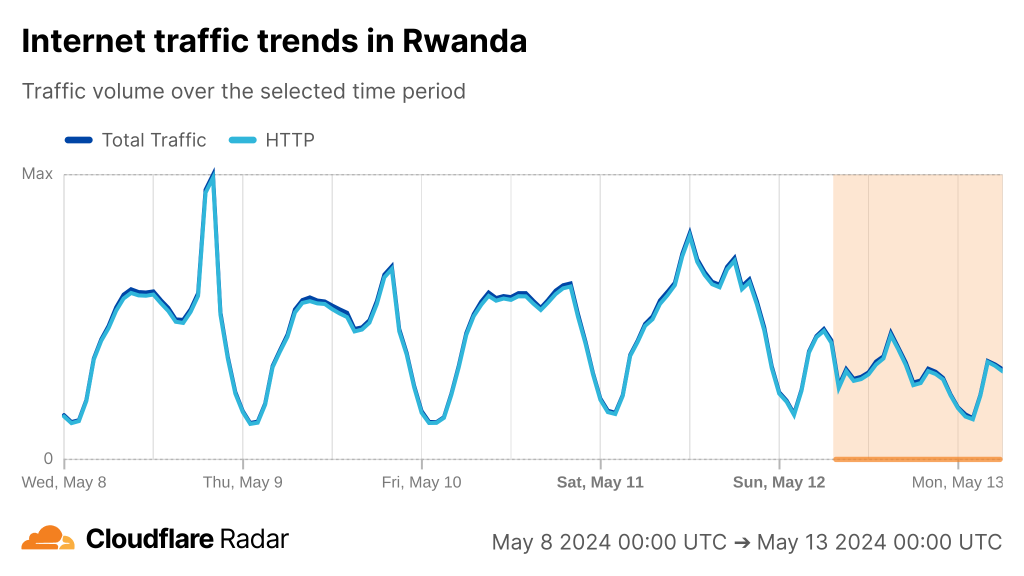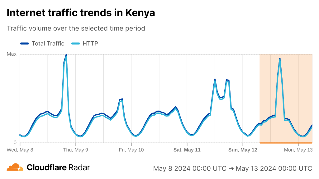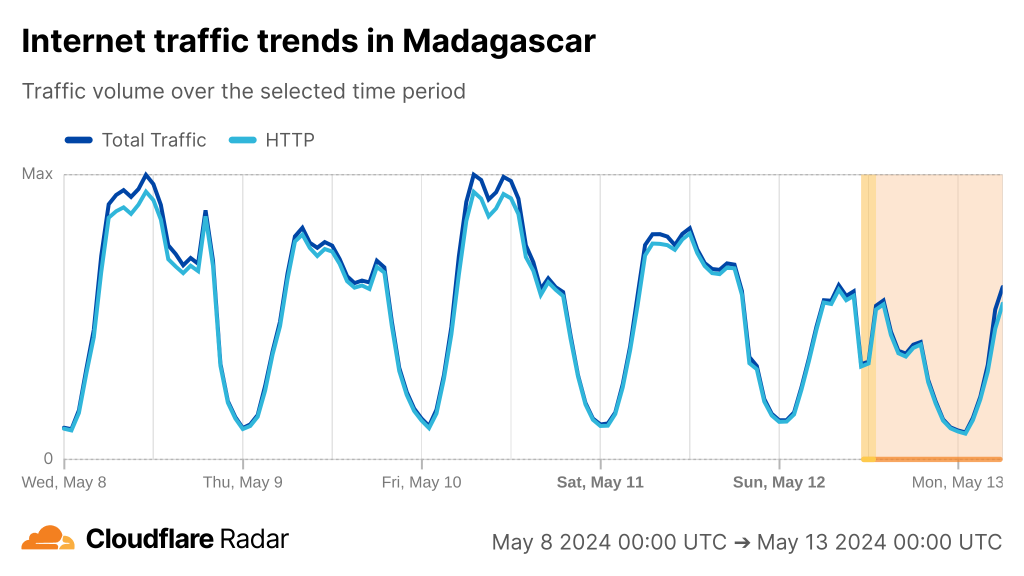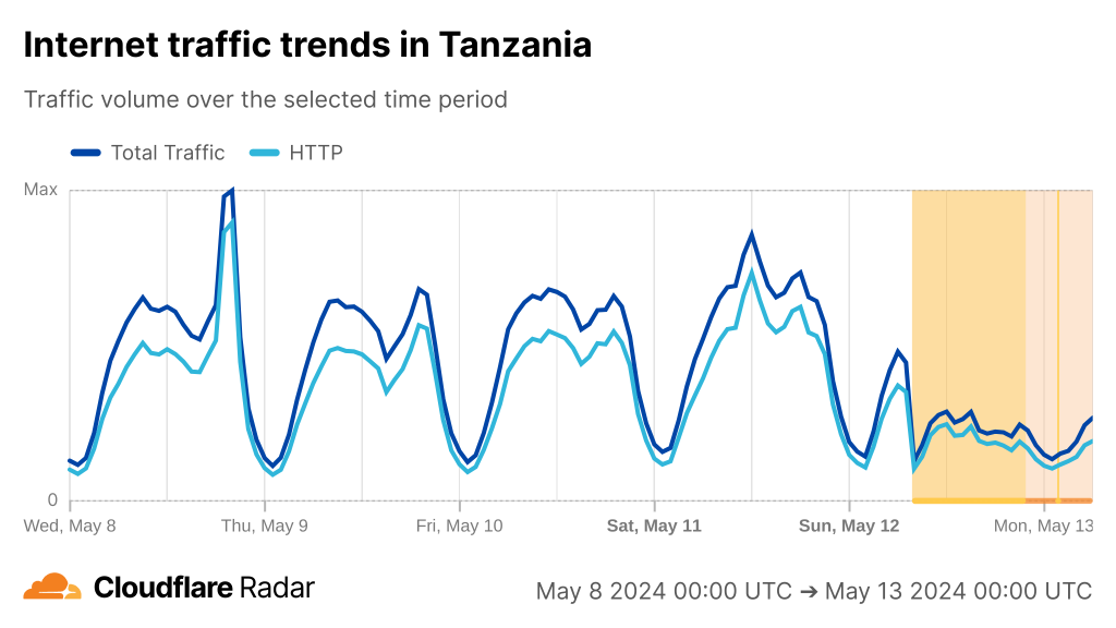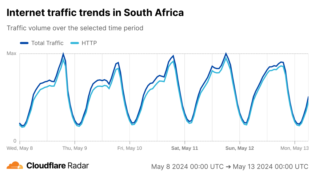 If we look at Cloudflare Radar, we can see the cuts have had a varying degree of impact on countries along the East coast of Africa from Kenya to South Africa.