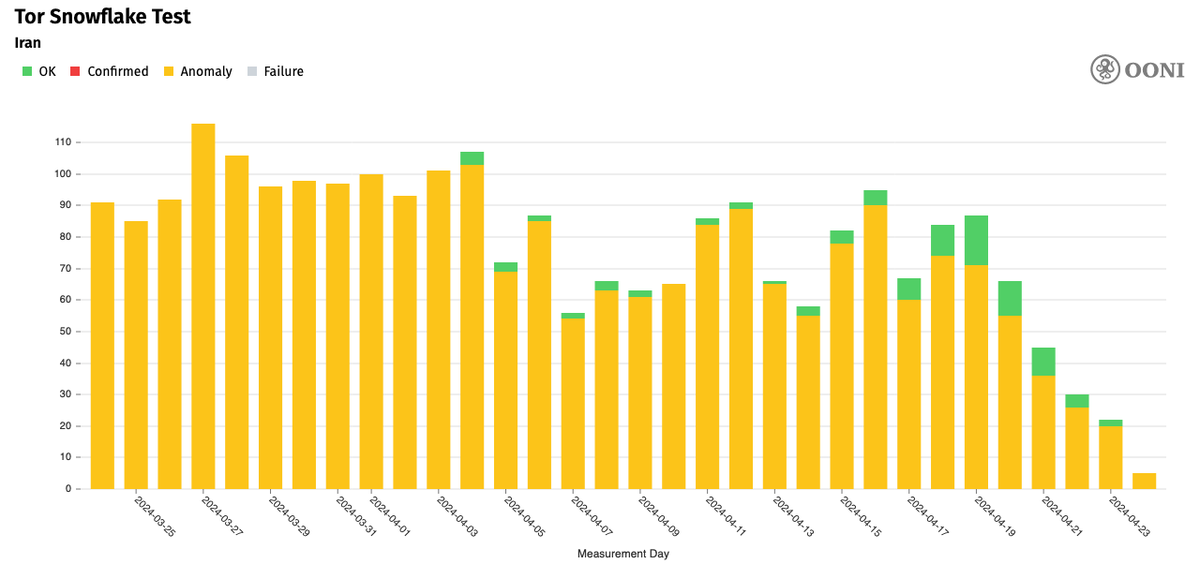 Time series column chart showing the number of anomalies and failed tests for Tor Snowflake accessibility in Iran.