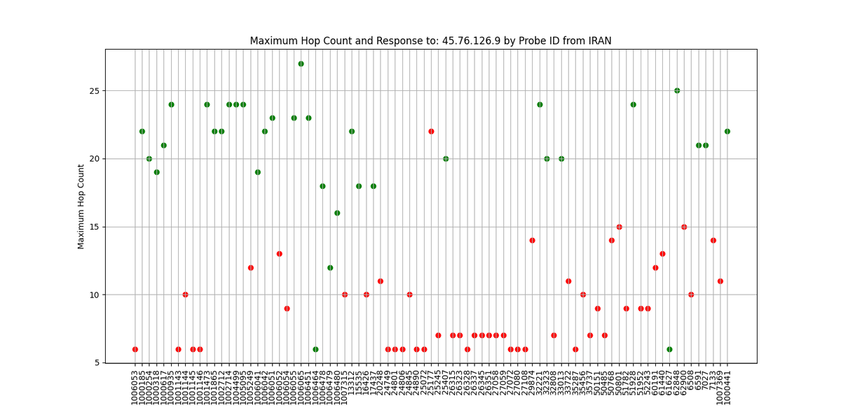 Plot showing the number of hops from RIPE Atlas Probe in Iran to a server in Mumbai, India