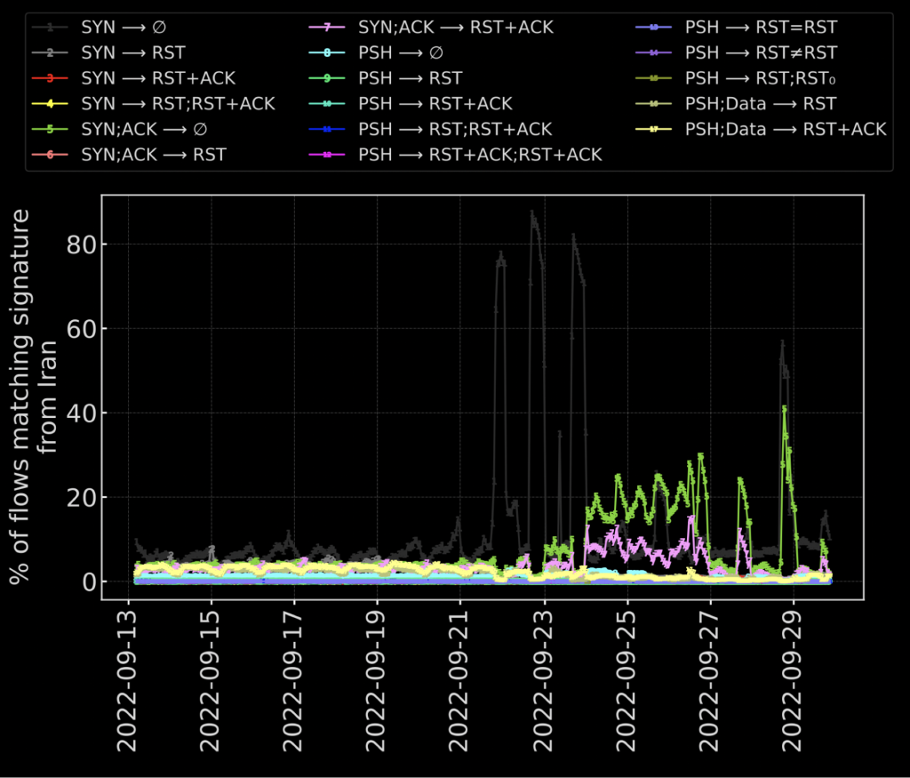 Figure 2 — Passive detection of the start of the censorship event in Iran in September 2022, showing how different tampering efforts were initially used. Learn more.