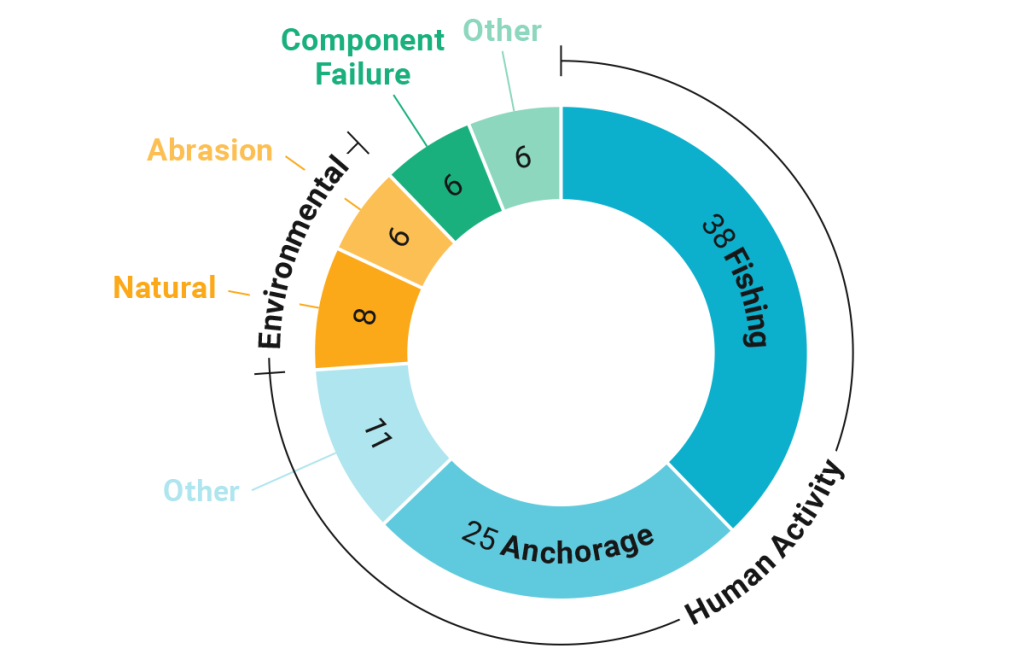 According to the United Nations, 150 to 200 subsea cable faults occur annually. Fishing and shipping activities account for nearly two-thirds of the total (Figure 2).
