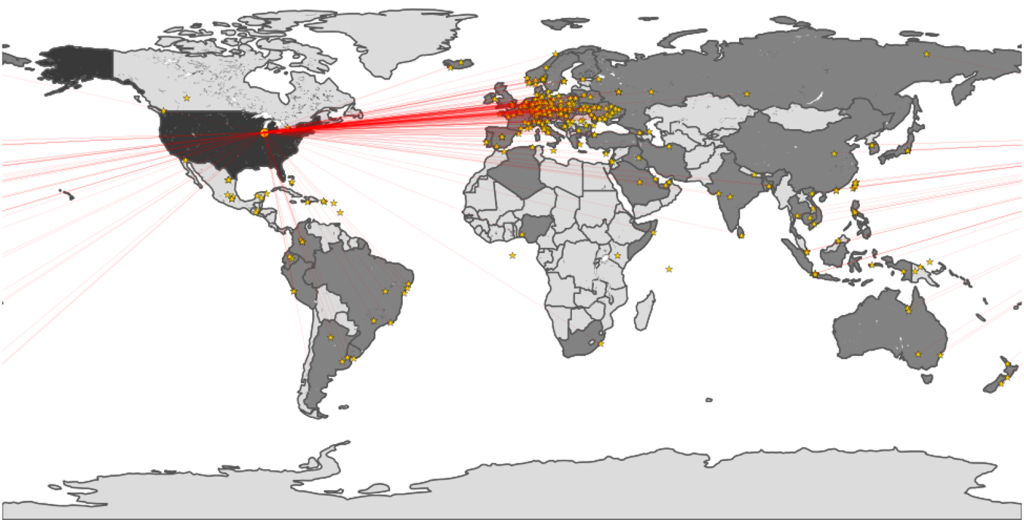 Our study revealed a vast network with links spanning thousands of kilometers and central nodes connecting as many as 45 countries.