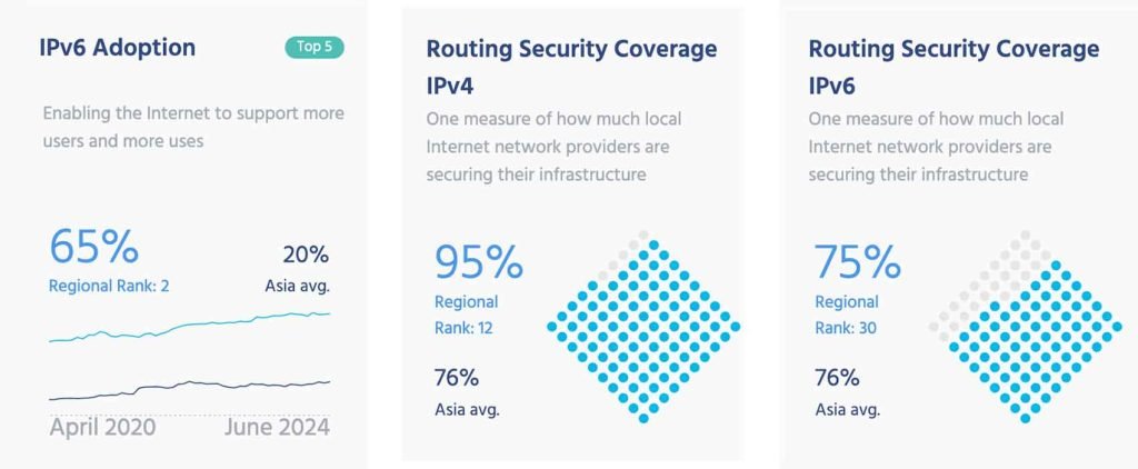As previously noted, Internet resilience relies on numerous factors. As such, it's important to note the advances that Malaysia has made in other areas of its resilience, too, particularly its IPv6 adoption and routing security coverage.