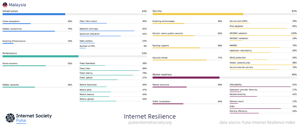 This vulnerability is noticeable in Malaysia's Internet Society Pulse Internet Resilience Index profile (Figure 3), with Infrastructure resilience (43%) ranking as the lowest of the four pillars we use to measure Internet resilience.