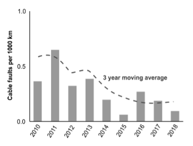 The number of faults per unit length is decreasing (Figure 2), continuing a longer-term trend of increasingly resilient subsea cable systems. This is a testament to the subsea cable industry's learning from past instances of cable damage, improving cable routing and design, and commissioning and listening to the science that provides a key evidence base to inform decision-making.