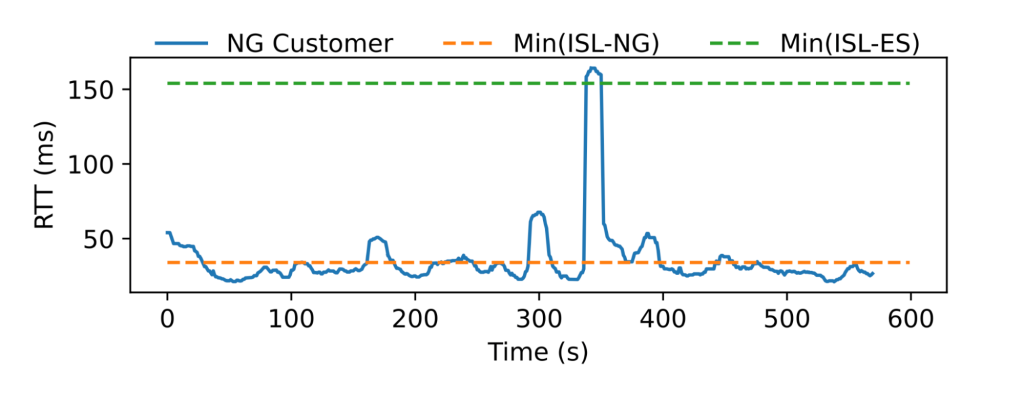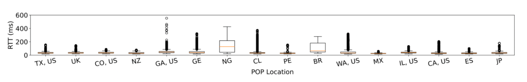 In one instance (Figure 2), a Nigerian customer's RTT increased between 2 and 5 times the median, indicating that the satellite service, in this instance Starlink, is likely connecting customers with distant ground stations.