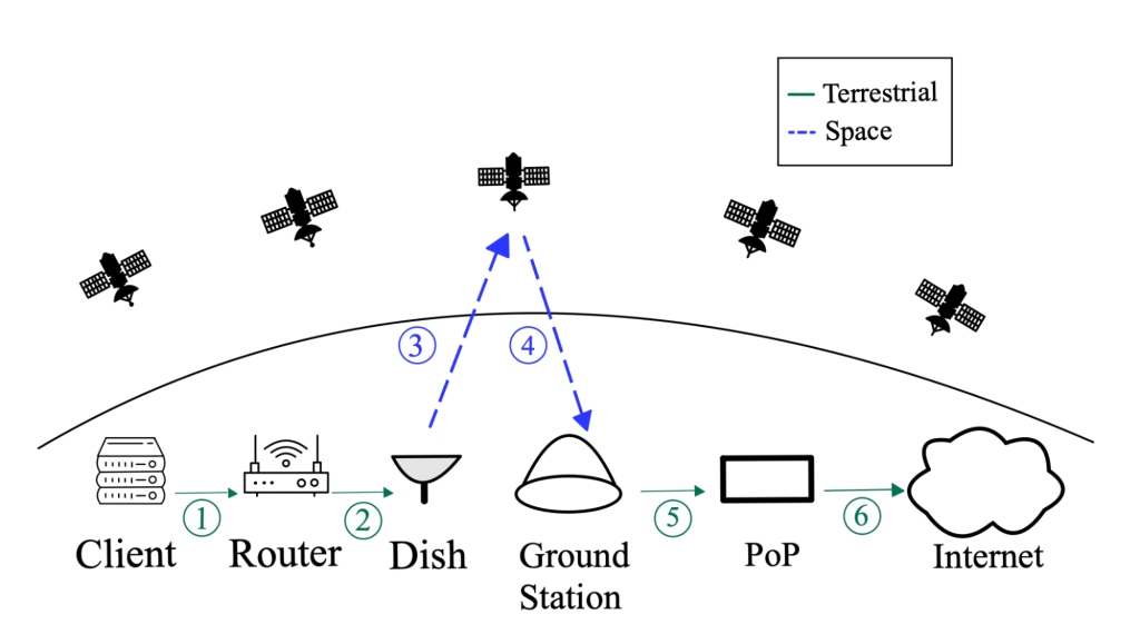 LEO satellite networks consist of hundreds to thousands of satellites that orbit 180 to 1,300 miles from Earth. The most basic and widely deployed LEO architecture follows a "bent pipe" routing scheme (Figure 1): when a LEO client sends a packet to the public Internet, the packet is sent to a satellite using a dish and is received by a ground station before forwarding to a Point of Presence (POP). Some newer satellite architectures are equipped with ISLs, which allow satellites to relay packets to each other in space until a ground station is in view.