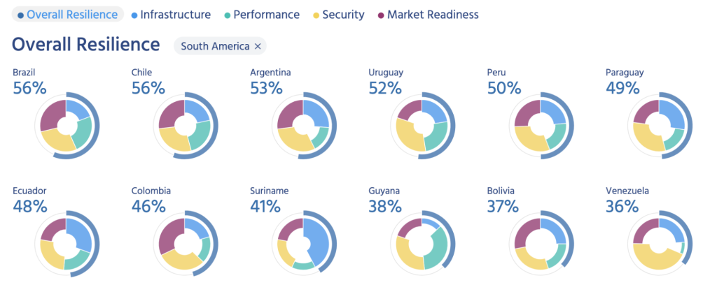Donut charts showing the Internet Resilience Index score for South American countries.