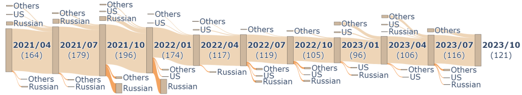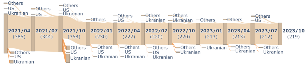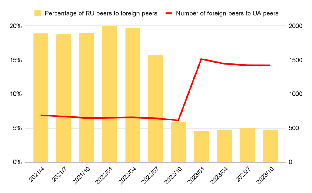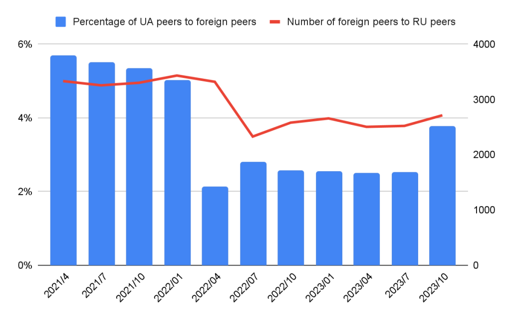 Additionally, the percentage of Ukrainian peers compared to total foreign peers shows a significant decline, dropping from 5.61% to 2.11% in April 2022 and remaining below 2.5% for most of the timeline. This reinforces the diminished P2P relationship between Russia and Ukraine. Interestingly, there was a slight increase to 3.4% in October 2023, but the overall trend reflects the isolation of Russian P2P networks.