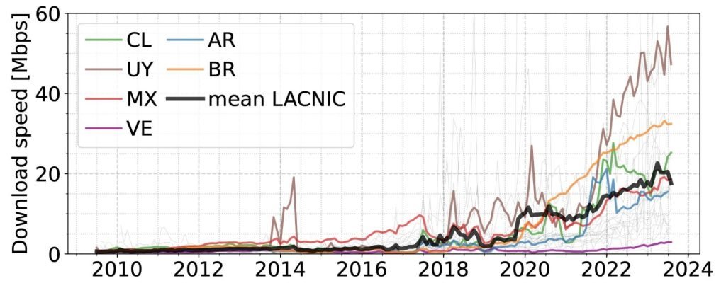 Figure 2 — Average download speed for Argentina (AR), Brazil (BR), Chile (CL), Mexico (MX), Uruguay (UY), and Venezuela (VE) and the mean download speed for all of the Latin American Network Information Center (LACNIC) region from 2010 to 2023.