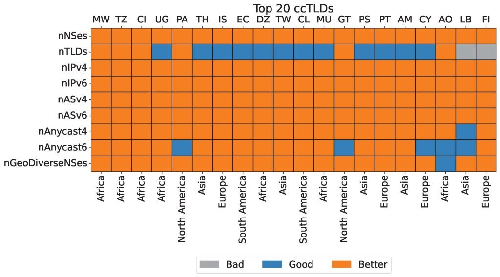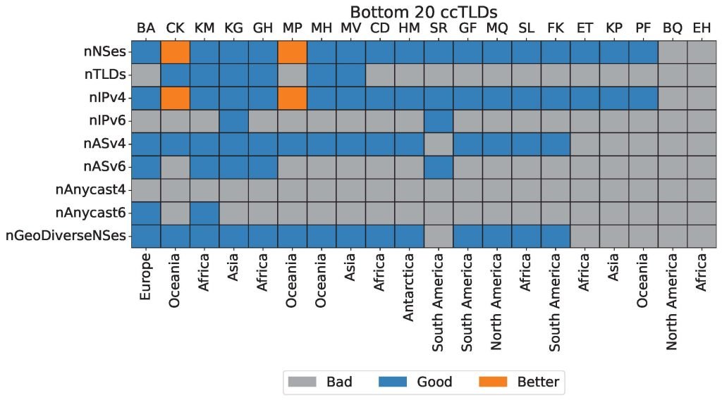 In Asia, the ccTLDs for North Korea (KP), the Republic of Maldives (MV), and Kyrgyzstan (KG) rank among the least mature. In the case of North Korea, its strict limitations on Internet access for its citizens might contribute to the underdevelopment of its DNS infrastructure. Notably, almost all of the 20 least mature ccTLDs lack critical DNS resilience features, such as Anycast infrastructure, multiple IPv6 addresses, or networks spanning multiple countries, highlighting issues with resilience.