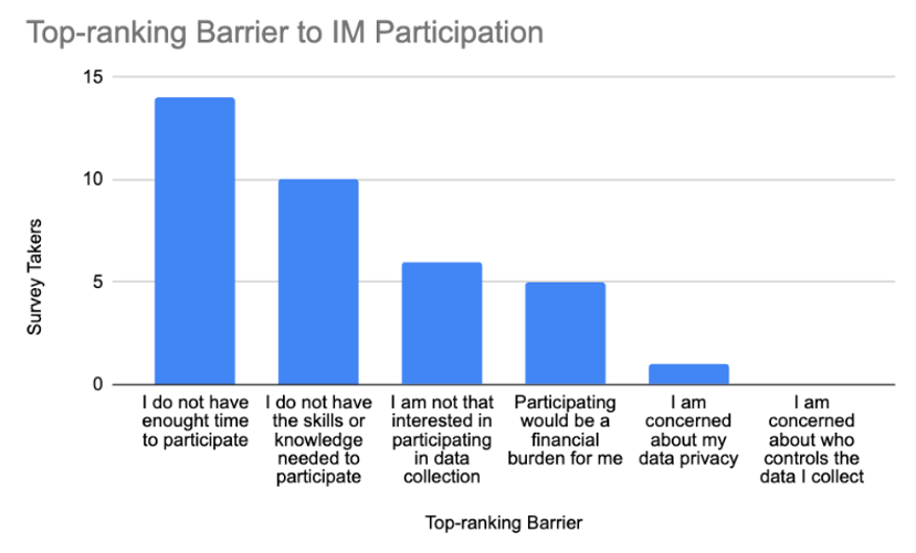 Technical literacy and doubts about data accuracy were barriers, and Non-White and Hispanic respondents were about two times less likely to participate due to privacy and data ownership concerns. This highlighted the need for platforms to make more explicit connections between data collection and broader impacts and carefully manage data privacy.