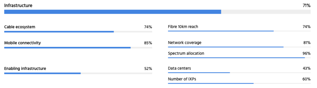 Türkiye' scores most strongly for the Infrastructure pillar, where all indicators are very positive, with the exception of data centers.