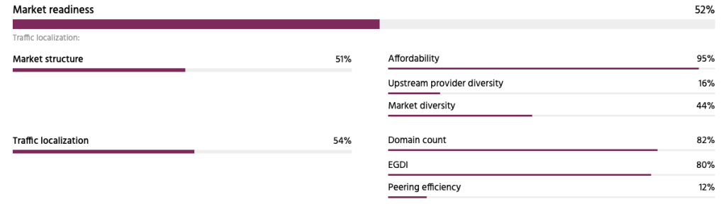 Finally, Market Readiness, while largely positive, suffers due to a lack of upstream provider diversity and relatively low levels of peering both of which are reflected in the Pulse Country Report for Türkiye.